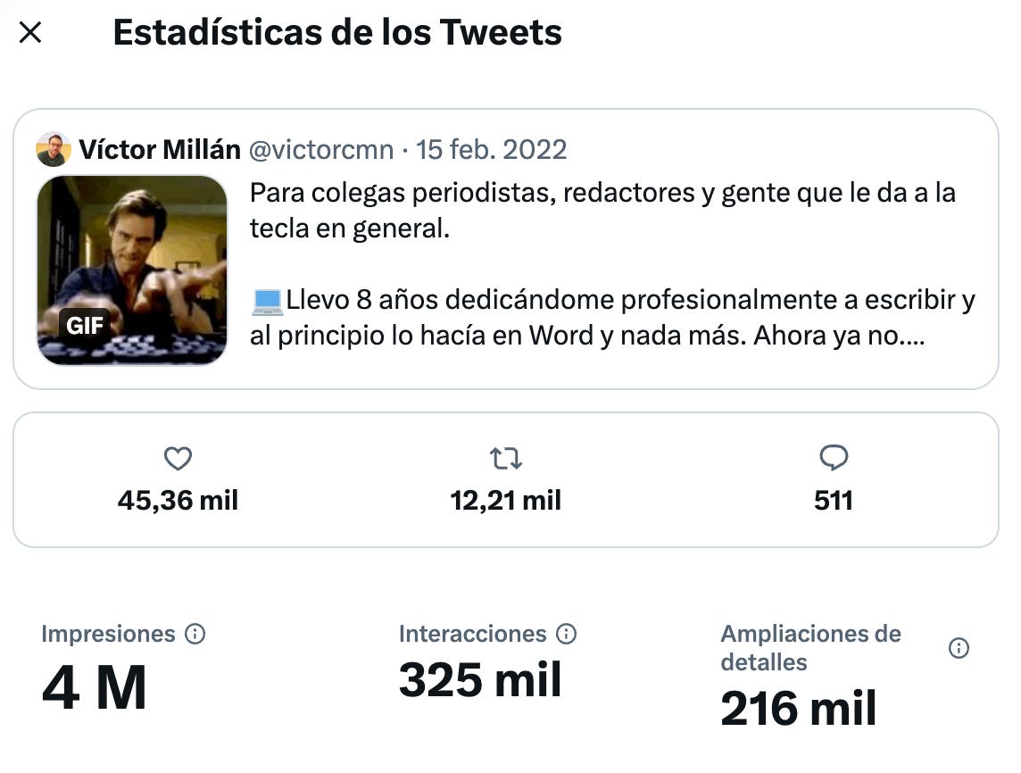Cree mi cuenta en 2011 pero apenas la usaba, hasta que publiqué un hilo (por probar una herramienta de la que habíamos hablado en Haciendo Cosas) que se fue a los 4 millones de visualizaciones.